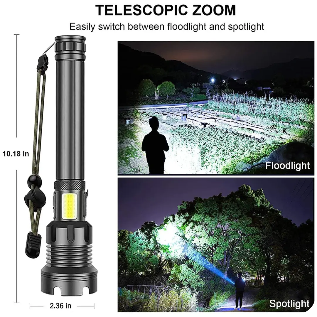 Water Resistant USB Rechargeable LED Flashlight delivers strong lighting with seven modes, perfect for reliable use at night. Its durable construction and telescopic zoom allow for adjustable focus, providing the right amount of light for any situation. USB rechargeable, this flashlight is convenient and eco-friendly, making it an essential tool for nighttime activities.
