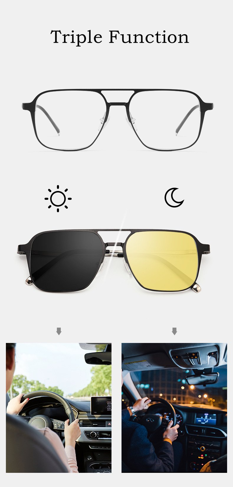 Lakini faida haziishii hapo. Ubunifu wetu wa 3-in-1 hutoa utofautishaji usio na kifani ili kukidhi kila hitaji lako. Ukiwa na lensi zinazobadilishana, unaweza kubadilisha bila shida kati ya lensi zilizogawanyika, wazi, na zenye rangi, ukizoea kubadilisha hali nyepesi na upendeleo wa kibinafsi kwa urahisi. Iwe unaendesha gari, unavua samaki, au unafurahiya kutembea kwa raha, miwani yetu ya jua hutoa suluhisho bora kwa kila hali.