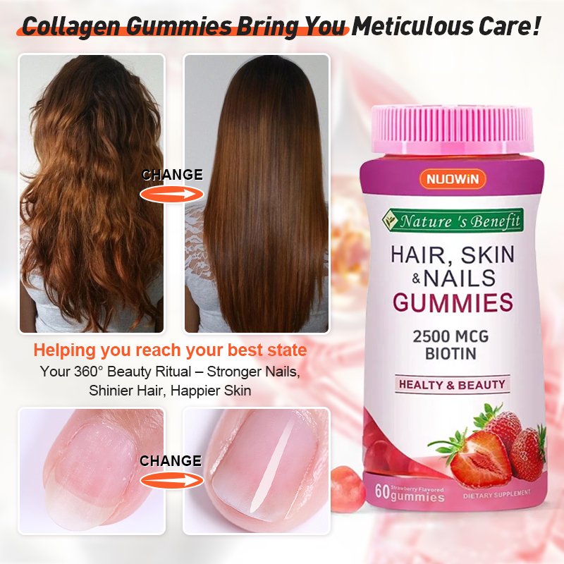 💊 Gummies formulated with biotin, collagen, vitamins C and E to nourish hair, skin and nails.