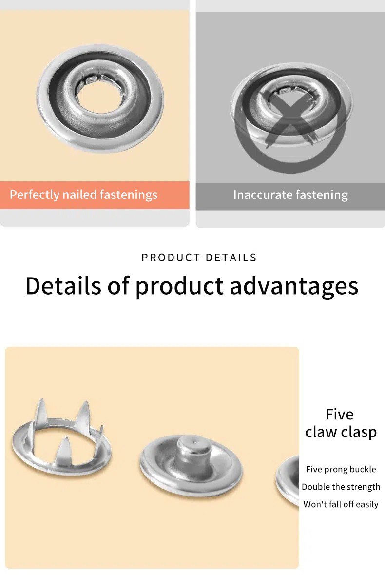 Ufanisi katika Ufungaji wa Nguo: Kifaa cha Pinces kikiambatana na seti ya vifungo vya chuma vya kushona vinavyokuja kwa wingi, kinakupa ufanisi wa hali ya juu katika kufunga nguo zako. Vifungo vyenye umbo la tundu tupu na solidi, pamoja na mishipa mitano, hufanya kazi ya ufungaji iwe rahisi na ya kitaalamu.